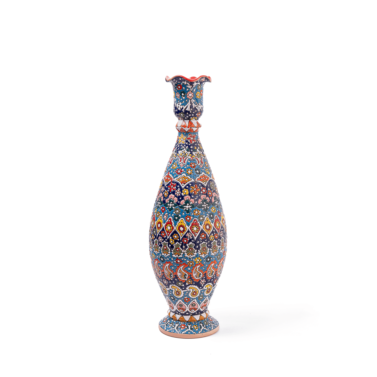 Sức hút của chiếc bình gốm sứ Ba Tư này đến từ dáng vẻ thanh thoát với thân bầu mềm mại, miệng loe duyên dáng trên một chân đế vững chắc. Toàn bộ bề mặt bình là một bức tranh sống động, nơi các họa tiết hình học và hoa lá truyền thống được vẽ tay thủ công một cách tỉ mỉ. Sự kết hợp hài hòa giữa các gam màu xanh dương, vàng, đỏ, trắng cùng lớp men bóng cao cấp không chỉ tạo nên vẻ đẹp rực rỡ mà còn đảm bảo sự bền màu vĩnh cửu.