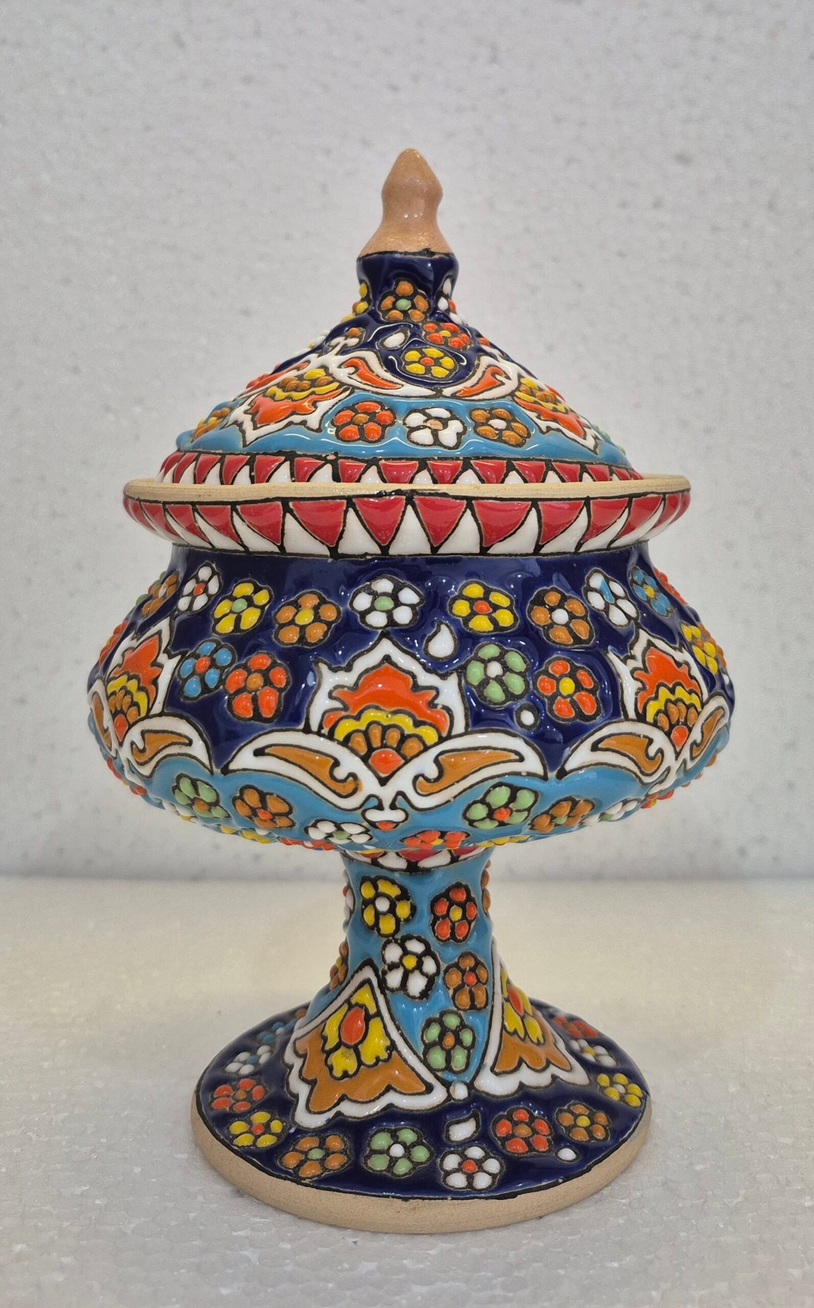 Điều làm nên giá trị độc đáo của chiếc hũ gốm sứ Iran này chính là những họa tiết hoa lá truyền thống được các nghệ nhân vẽ tay thủ công hoàn toàn. Trên nền gốm cao cấp, các gam màu rực rỡ như xanh dương, đỏ, vàng, trắng được phối hợp một cách hài hòa, tạo nên vẻ đẹp sống động và cuốn hút. Thiết kế cân đối với thân hũ tròn, chân đế vững chãi và nắp nhọn duyên dáng, kết hợp cùng lớp men bóng mịn giúp sản phẩm không chỉ đẹp mà còn bền bỉ và dễ vệ sinh.